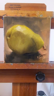 I primed my canvas with Cadmium Red Deep because red is complimentary to the pear's green color. Also, you can't tell from the photograph of the set-up, but the pear was mostly light yellow-green with little swathes of red, which looked a lot like Cadmium Red Deep to me. I thought that if some poked through, it would add to the painting. (And, I'm still out of Alizarin Permanent.)