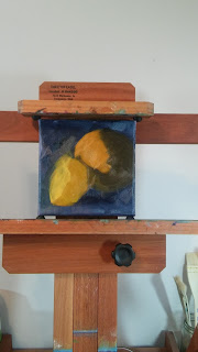 I toned my canvas here with a muted transparent purple mixture of Ultramarine Blue, Viridian Green, and Alizarin Permanent. I chose a purple because it is the opposite or complimentary color of the lightest hue in my arrangement, which is yellow. When painting alla prima (wet-into-wet), some of the toned color will peek through in the brush strokes, and a complimentary color adds interest. Although my still life box is black, I planned to make the background more blue for interest and because it is the complimentary color of the main orange subject.